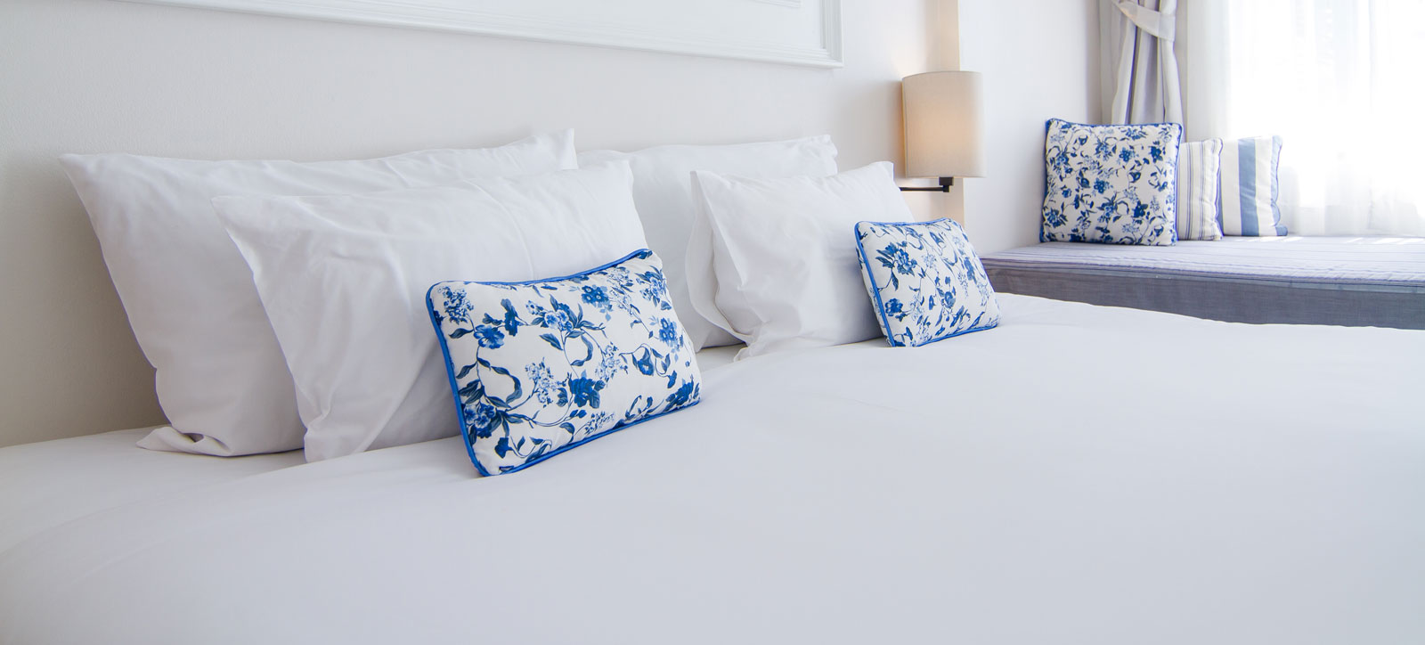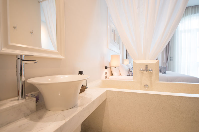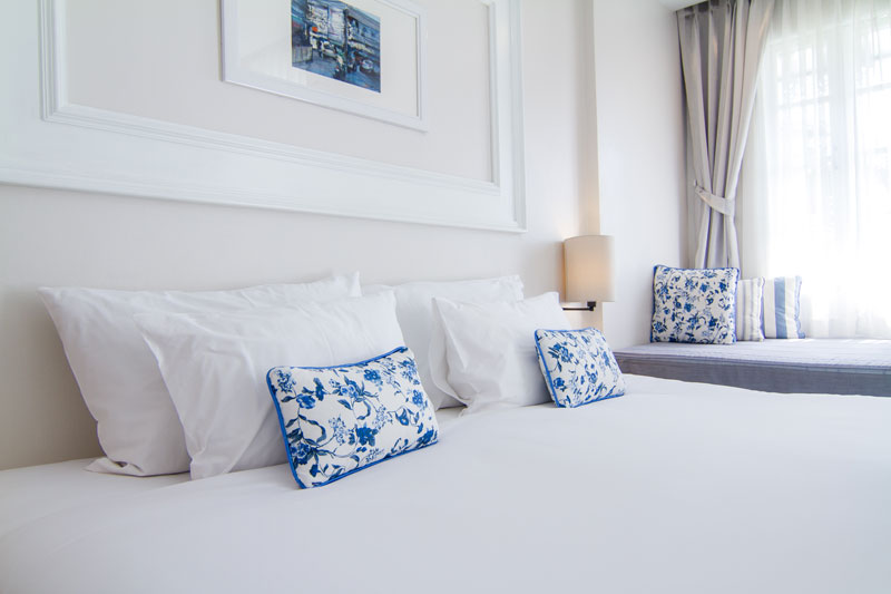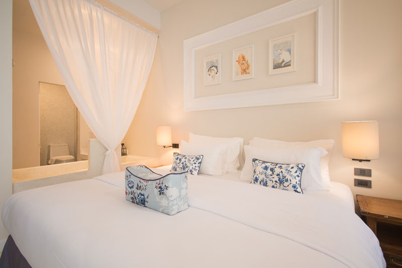 Each room is equipped with a double bed or two single beds (as per guest’s request), a daybed and a wardrobe. It is supplied with linens, beddings and bathrobes, decorated with original artwork, a limited collection wash basin, a lovely marble-topped coffee table with 2 slipper chairs and a custom made writhing desk with a lamp and chair.