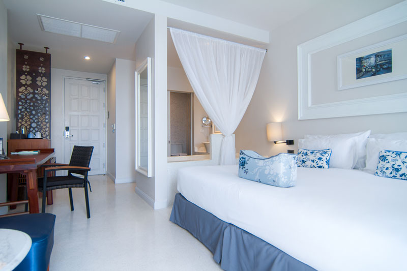 Rooms on the lower floors come with views of a private garden, while those on the upper floors come with a balcony overlooking either the lush green mountains or the colourful weekend market.
